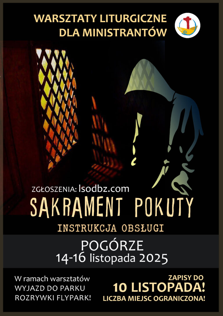 Serdecznie zapraszamy do udziału w kolejnej edycji warsztatów liturgicznych pt. „Sakrament pokuty – Instrukcja obsługi”. Tym razem wydarzenie dedykujemy młodszym ministrantom (klasy IV-VII). Spróbujemy odkryć jak ważna jest spowiedź w naszym życiu, jak dobrze się do niej przygotowywać, a przede wszystkim co zrobić by się jej nie bać. Odbędą się również zajęcia i ćwiczenia pomocne w byciu ministrantem. Warsztaty odbędą się w terminie 14-16 listopada 2025 w Ośrodku Rekolekcyjnym przy kościele NMP Królowej Polski w Pogórzu. Zaczynamy w piątek o 17.00 a kończymy w niedzielę o 13.00. Koszt udziału wynosi 250zł. W cenie: pełne wyżywienie, nocleg, wyjazd do parku rozrywki Flypark Bytom. Zapisy drogą elektroniczną przez formularz dostępny na naszej stronie https://lsodbz.com/ do 10 listopada. Zapis na wyjazd zostanie potwierdzony przez wysłanie informacji i karty zgłoszeniowej.